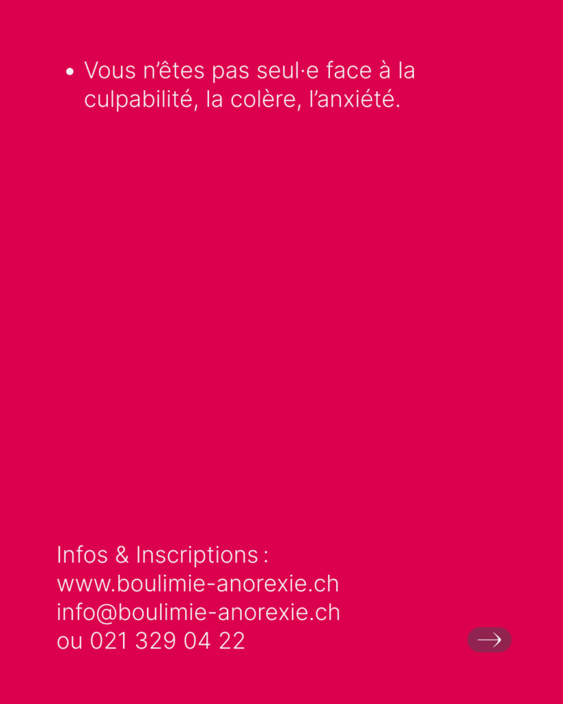 Pour vous inscrire ou obtenir plus de renseignements, contactez-nous à info@boulimie-anorexie.ch. Vous pouvez également consulter les informations sur le groupe pour les proches sur notre site internet.
