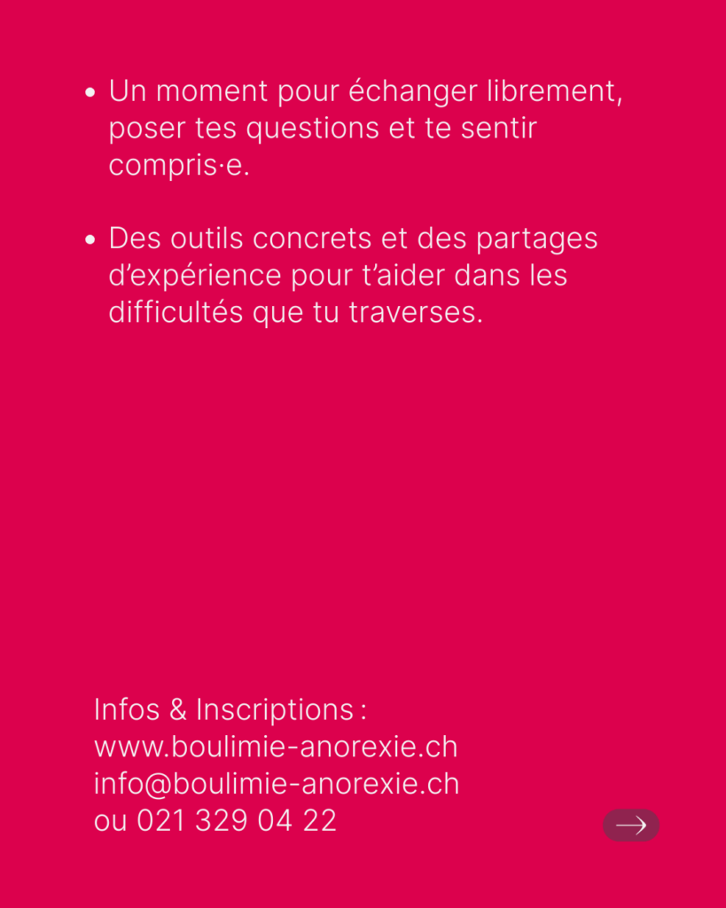 Davantage d’informations ici et Inscriptions sur : info@boulimie-anorexie.ch