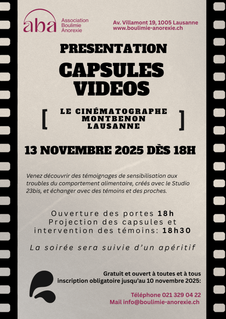L’Association Boulimie Anorexie Lausanne a le plaisir d’inviter le public à une soirée exceptionnelle dédiée à la présentation de capsules vidéos de sensibilisation aux troubles du comportement alimentaire (TCA), réalisées en collaboration avec le Studio 23bis.